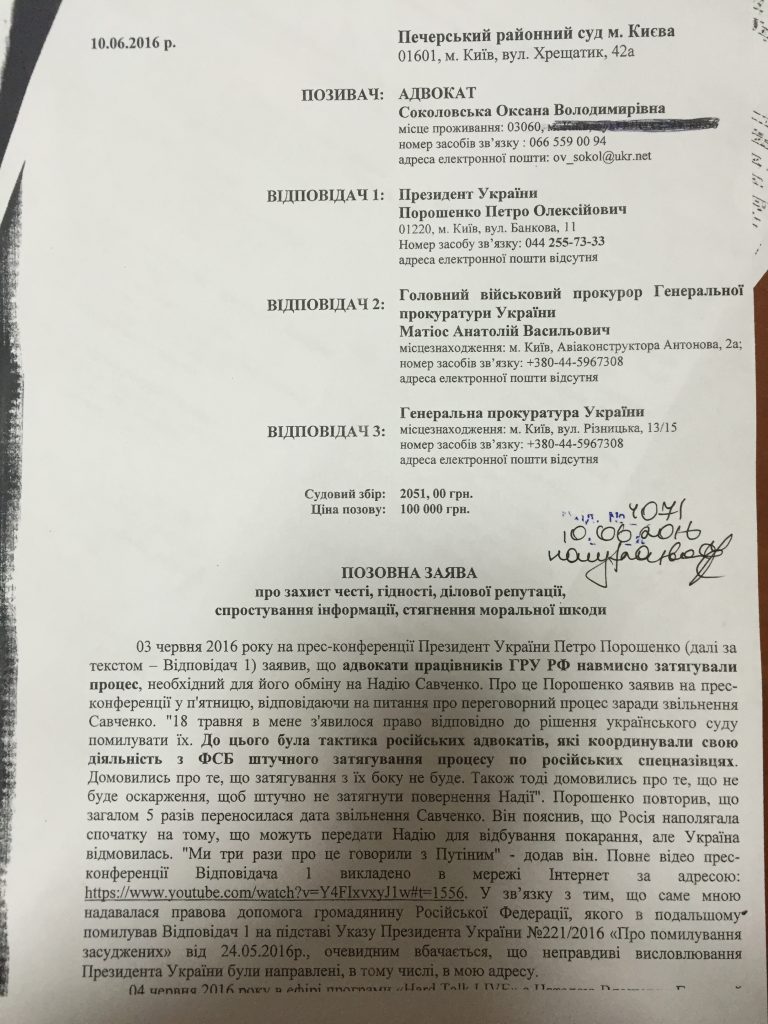 Сьогодні адвокатом Соколовською О.В. в канцелярії Печерського районного суду м. Києва була зареєстрована позовна заява про захист честі, гідності, ділової репутації, спростування інформації та стягнення моральної шкоди. Основними вимогами зазначеної позовної заяви, Відповідачами за якою є Президент України Петро Порошенко, Головний військовий прокурор Анатолій Матіос, Генеральна прокуратура України, є спростування недостовірної інформації щодо адвоката Соколовської О.В. — захисника Єрофєєва Є.В., поширеної Президентом України на прес-конференції від 03.06.2016р., а також спростування недостовірної інформації щодо адвоката, яка міститься у виступі Головного військового прокурора в ефірі програми «Hard Talk.LIVE» з Наталею Влащенко 04.06.2016р.